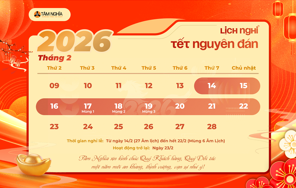 Nhân dịp Tết Nguyên Đán 2026, Công Ty Cổ Phần Dịch Vụ Tâm Nghĩa xin trân trọng thông báo lịch nghỉ lễ như sau: